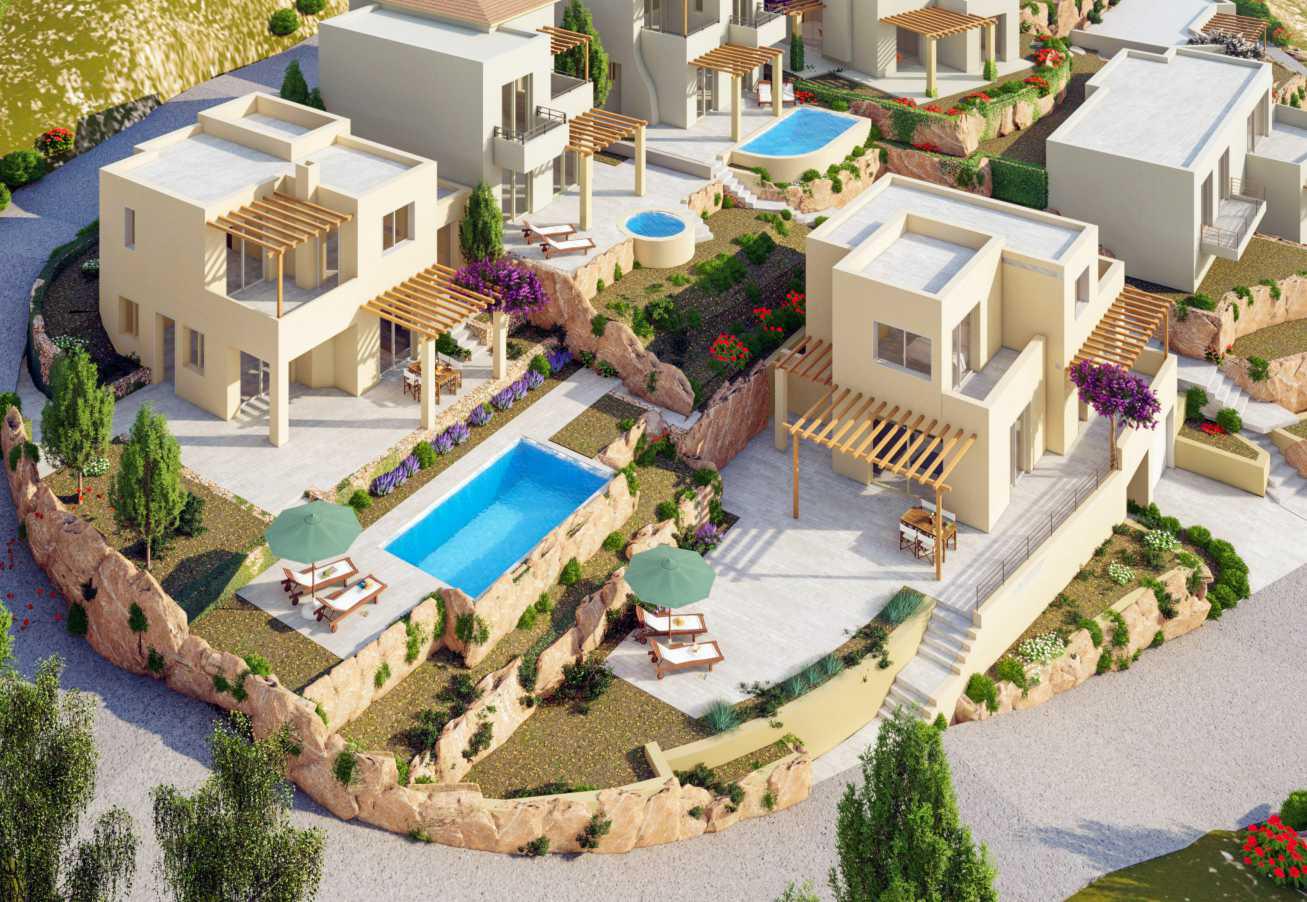Olympus villas have a variety of bungalows, split-level and two-storey detached villas all with the option of 3 – 4 or more bedrooms. Light coloured natural Cypriot stone adorns exteriors whilst dark wooden pergolas cover sun terraces. Cool down during the warmth of the summer season in your private swimming pool or relax in the warmth of your stone-dressed wood burning fireplace in the winter months.